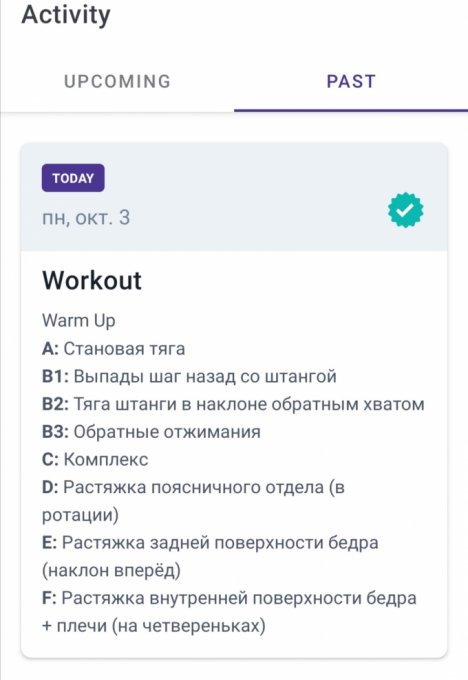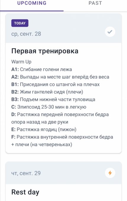 Завтра моя последняя пробная тренировка в бесплатном и режиме, в пятницу сделаю кардио и с 1 октября начинаем уже работать с этим тренером, на следующей неделе будем подробно разбирать питание.