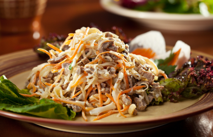 Отварите говядину, охладите и нарежьте тонкими полосками.