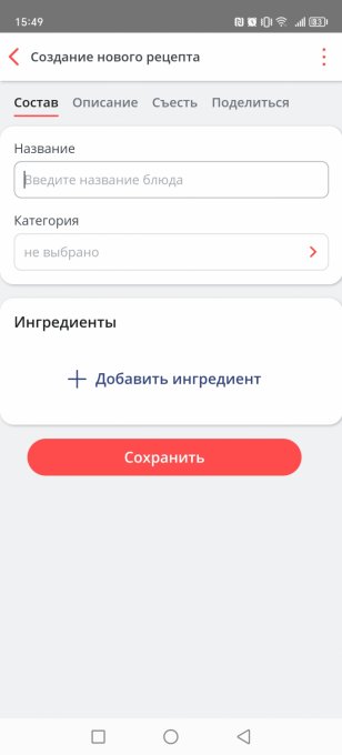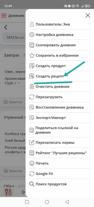 Откроется меню, выбирите, добавить рецепт, дальше вносите продукты, их вес и метод обработки.