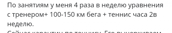 100-150 км бега в месяц+ теннис часа 2в неделю.