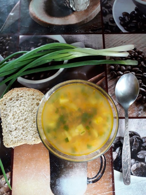 Суп гороховый, горбушка хлеба и зеленый лук(благо сегодня выходной
