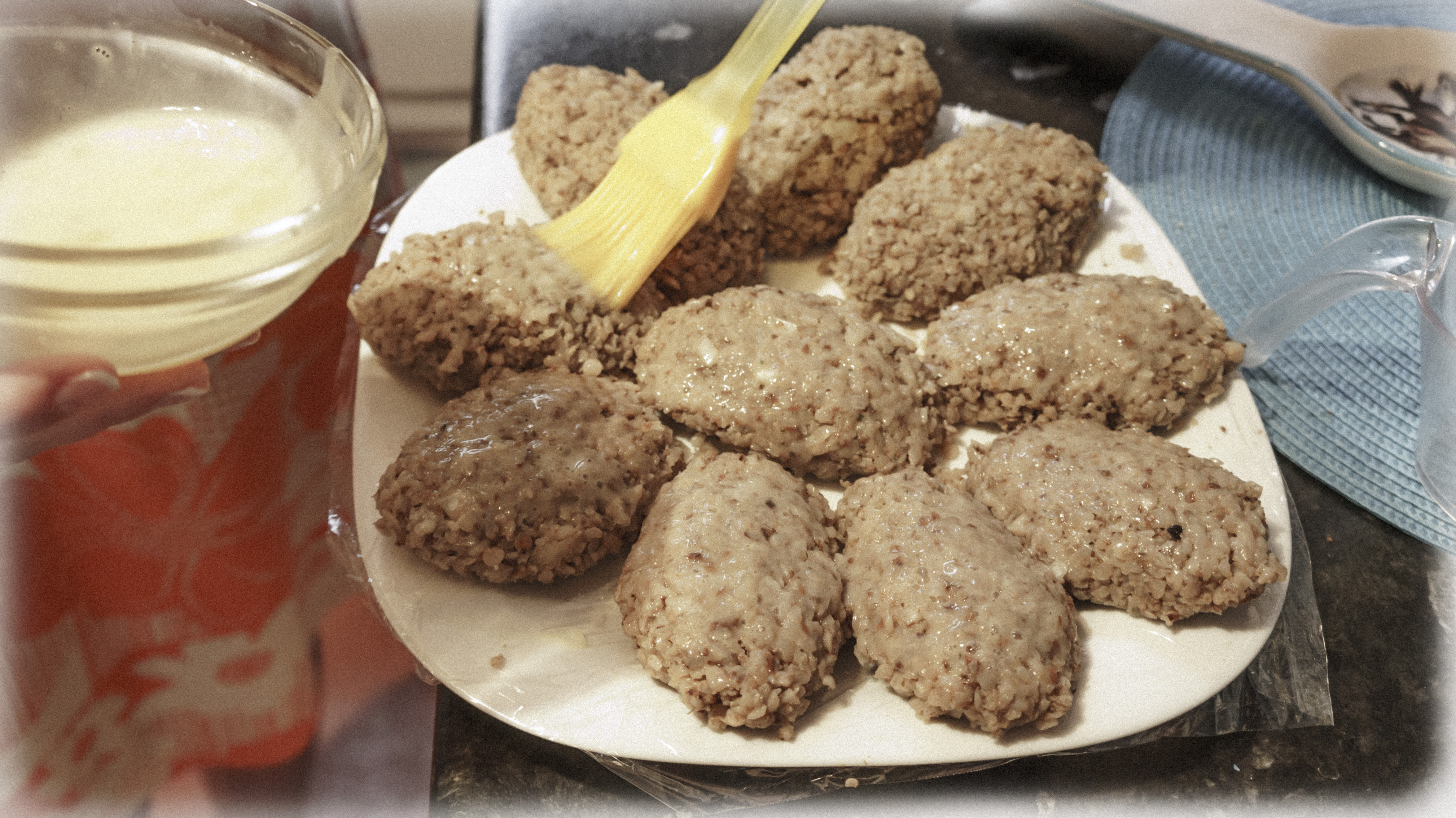 и мажем кисточкой готовые котлетки,чтобы хорошо