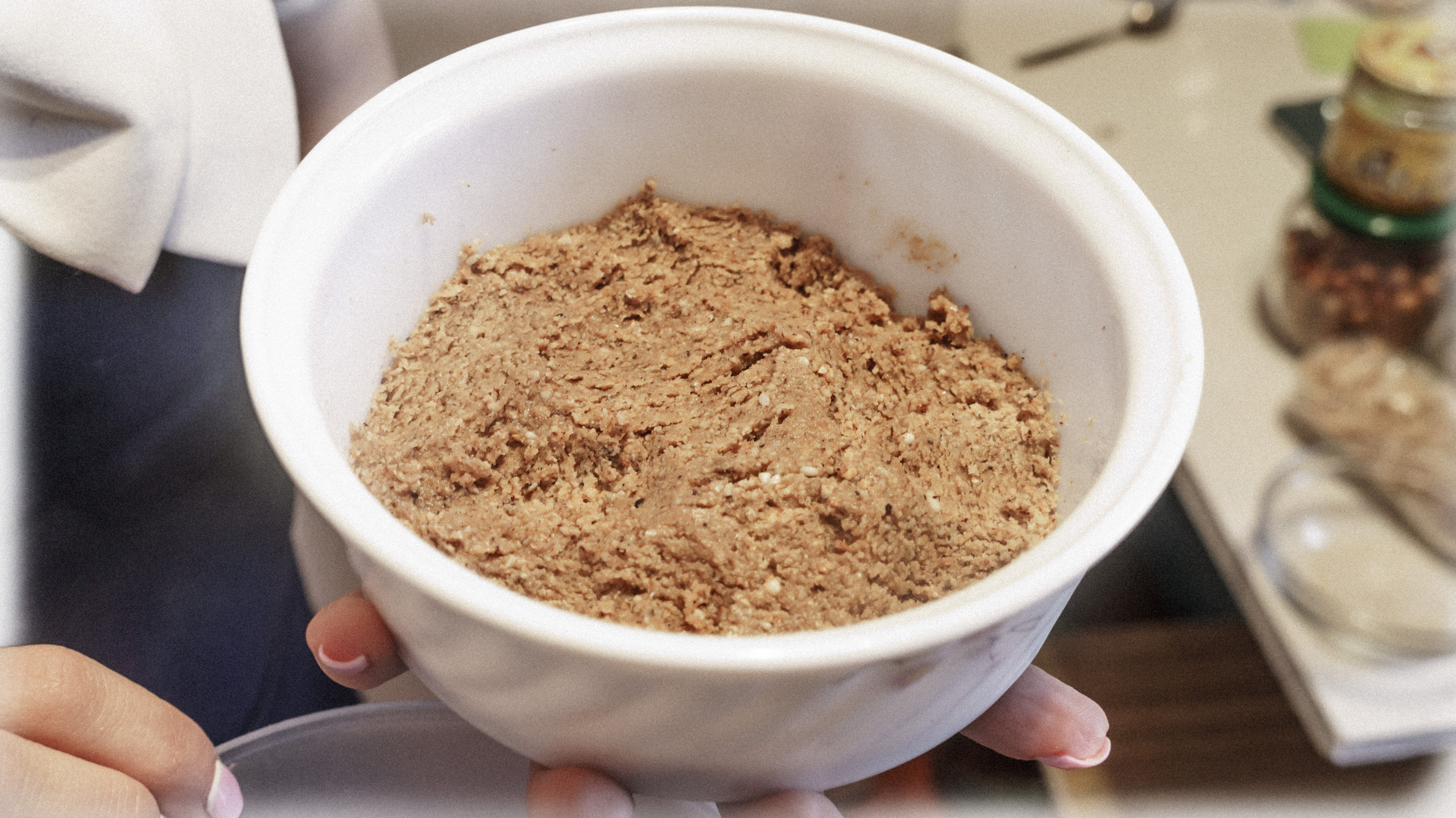 - Итак,кладем урбеч в общую кучу. Он густой,вязкий,я положила