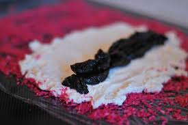 ее по пищевой пленке. Чернослив порежем пополам и выложим на