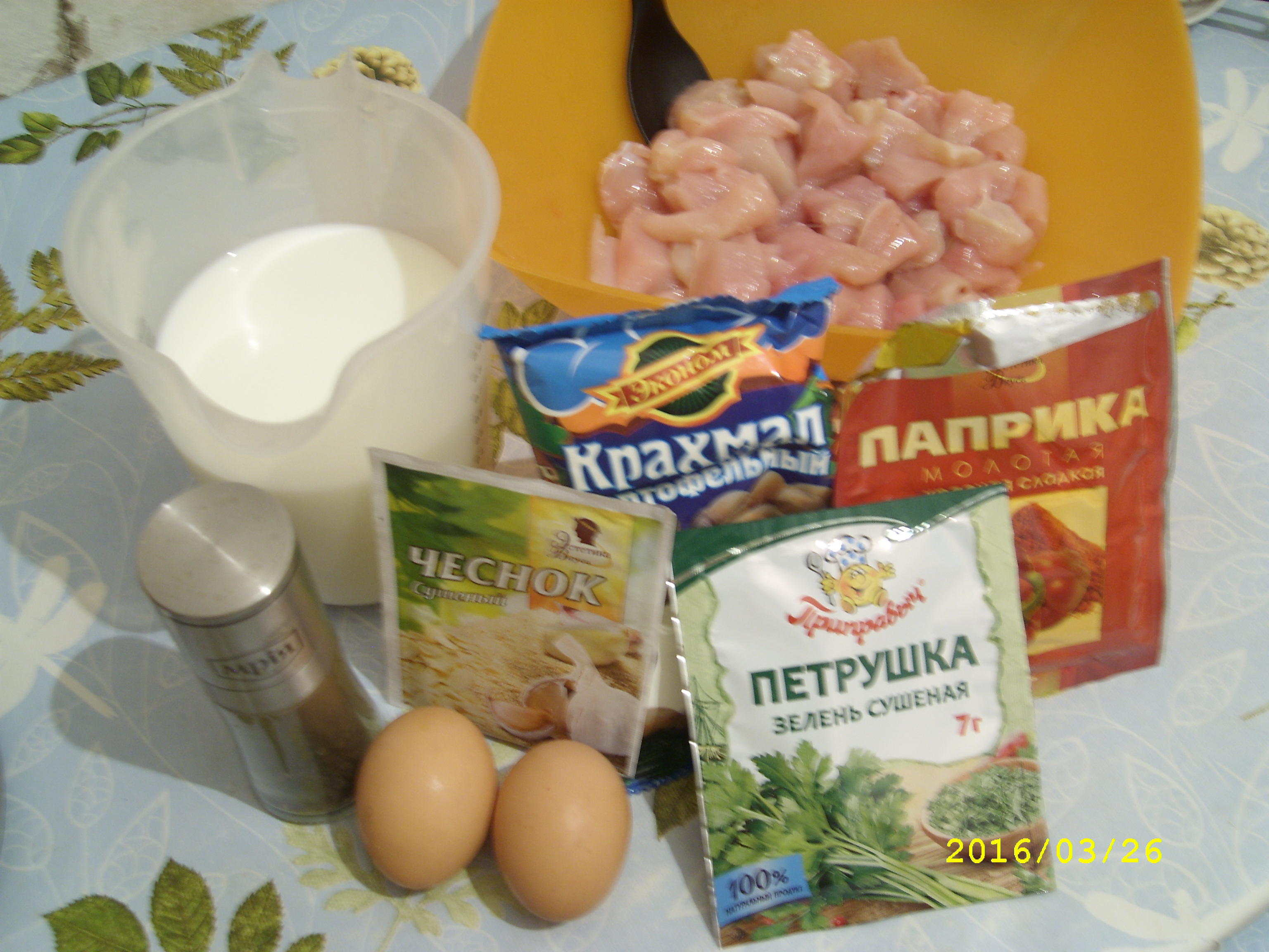 Нам нужны: курогрудь, молоко, яйцо, крахмал и специи. И главное