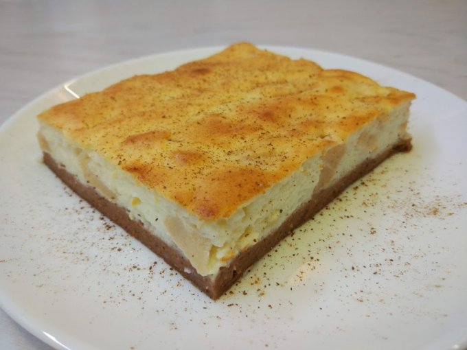 мягкий творог 4% 800 гр, 4 яйца, крахмал 70 г, сахар 60 г, яблоки 400 г, сахарозаменитель