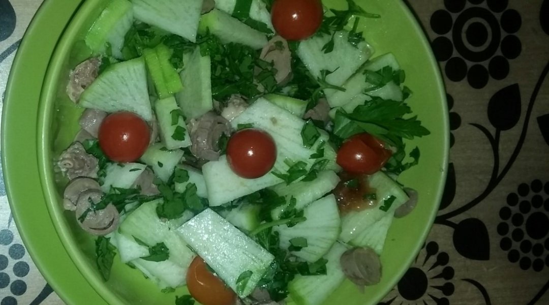 | Салат из зеленой редьки, куриных сердец, помидоров | 1 Порция |