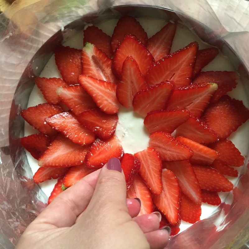 3. Разрезать клубнику на половинки и выложить ими 1 слой формы (см.