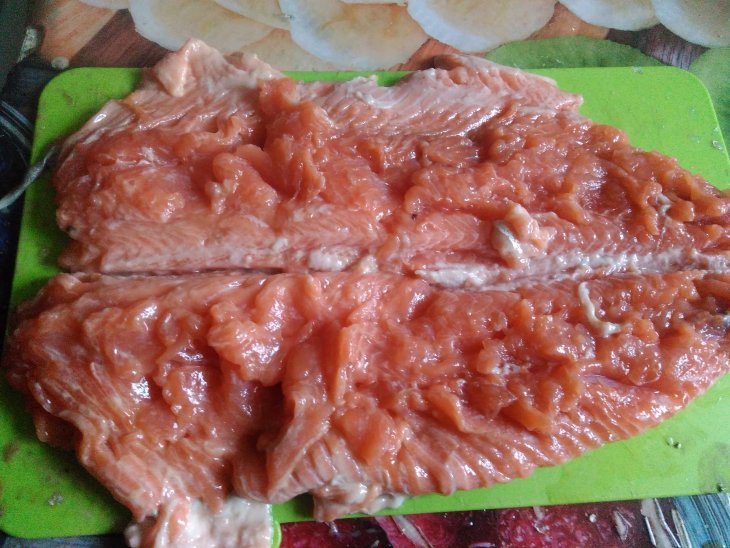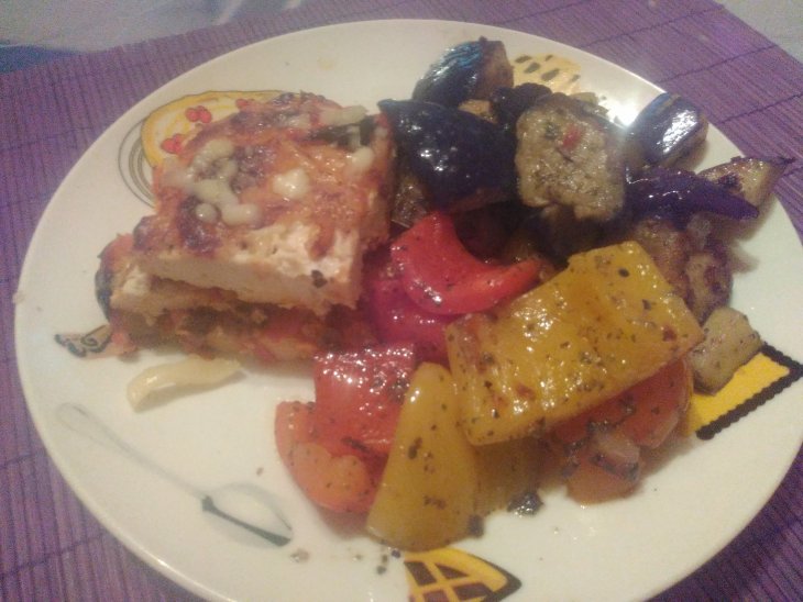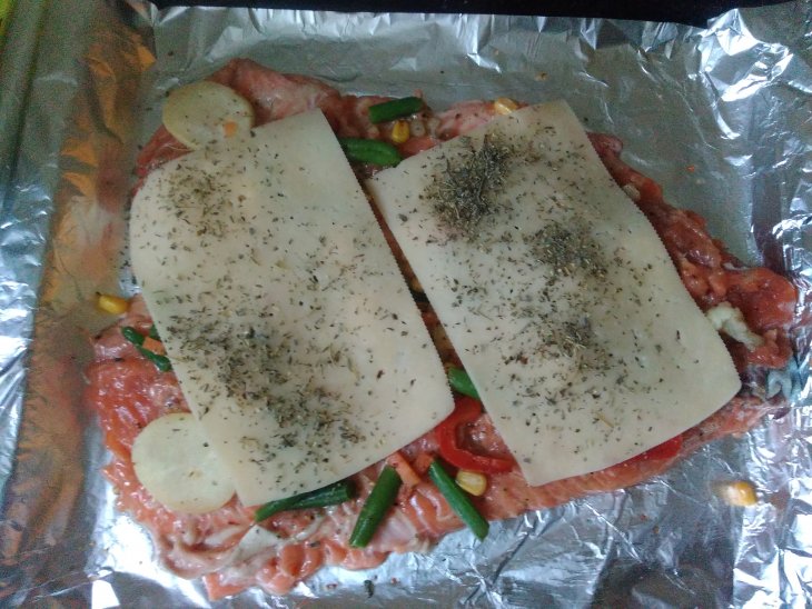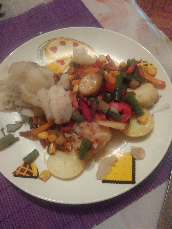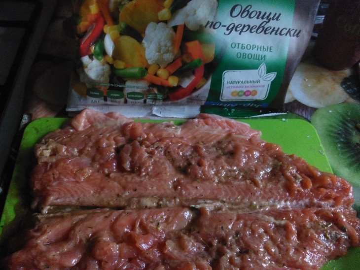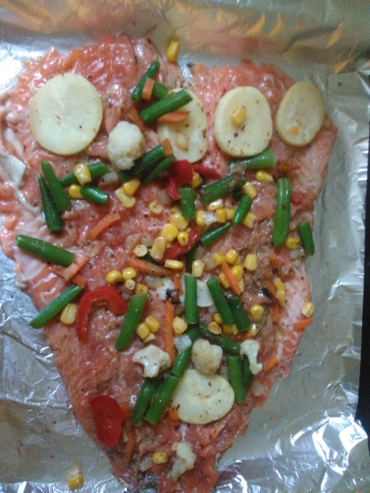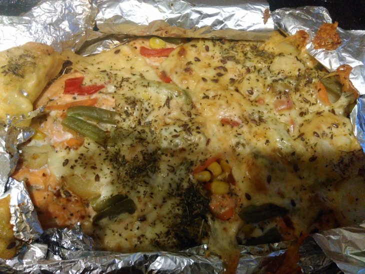 | Радужная рыбка с овощами по-деревенски и лёгким сыром |