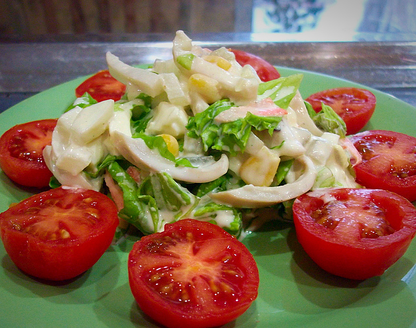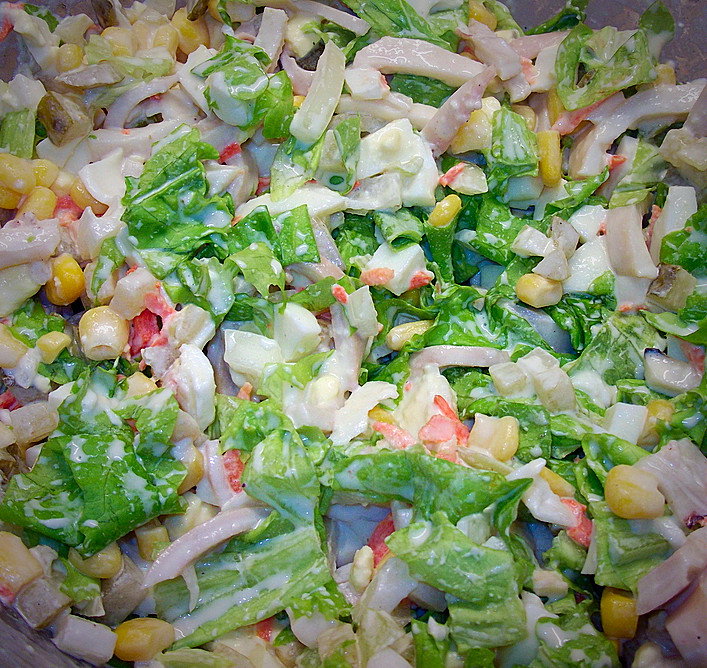 тоже готовила салат с кальмарами, так же добавились яйца, редис,