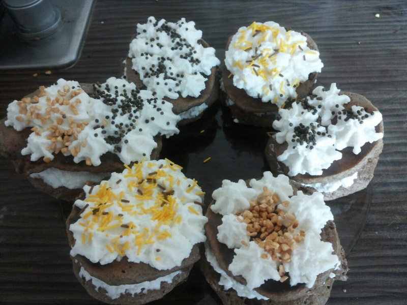 оладушком. Верх украшаем кремом из шприца, делая разные