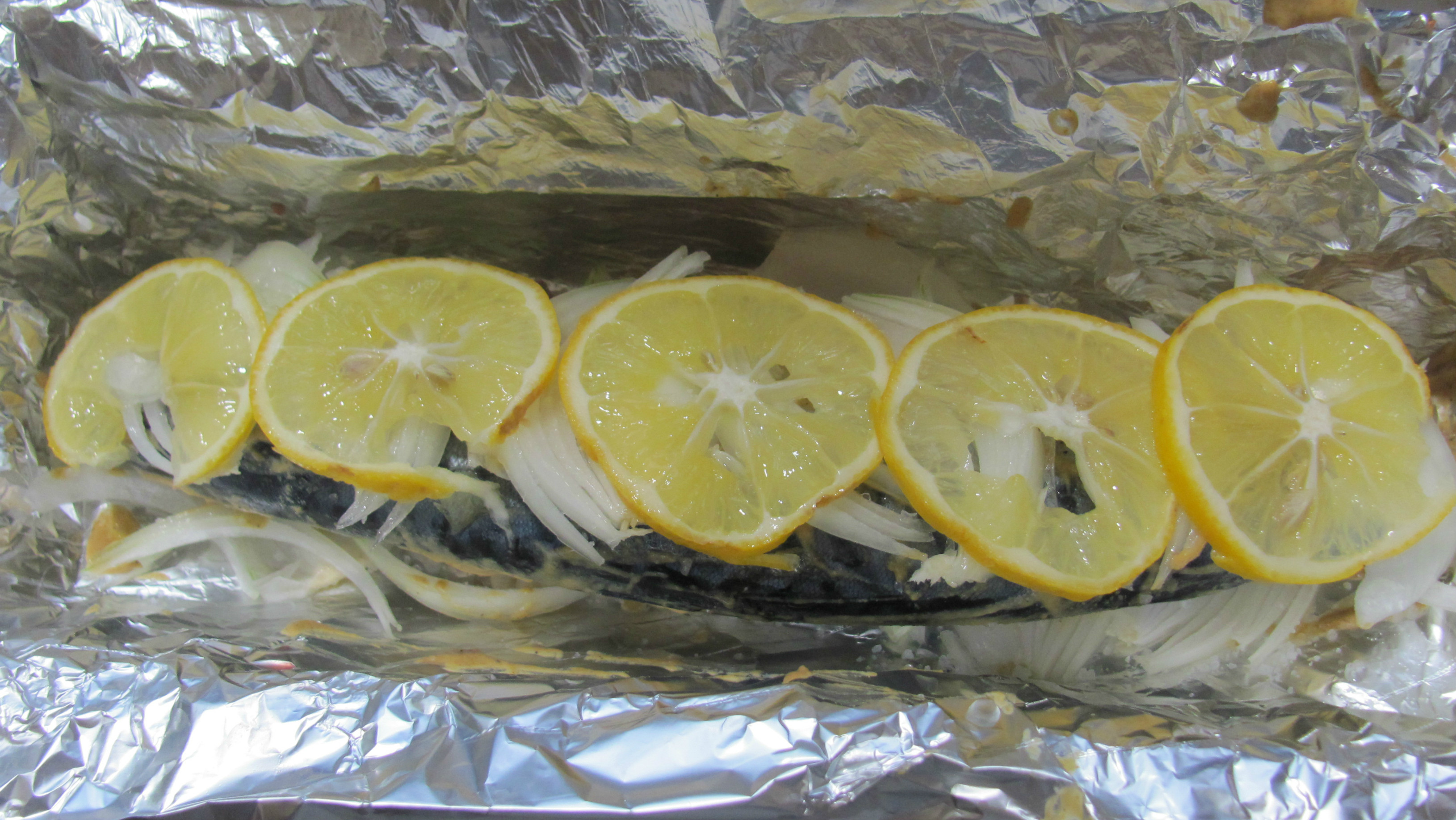 СКУМБРИЯ В ГОРЧИЦЕ, С ЛУКОМ И ЛИМОНОМ.