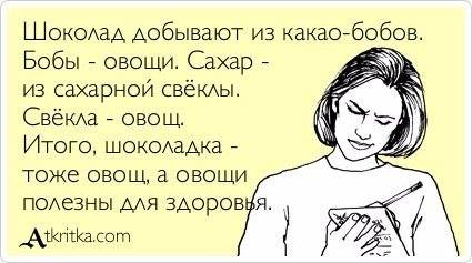 Вчера вечером не удержалась, хватанула шоколадку. Р адует то, что это был горький шоколад и всего 1 кусочек-около 10 г, неужели пробивается сила воли?
