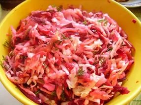 Попробую.)) Квашеная капуста+свекла вареная+лук репчатый+горошек