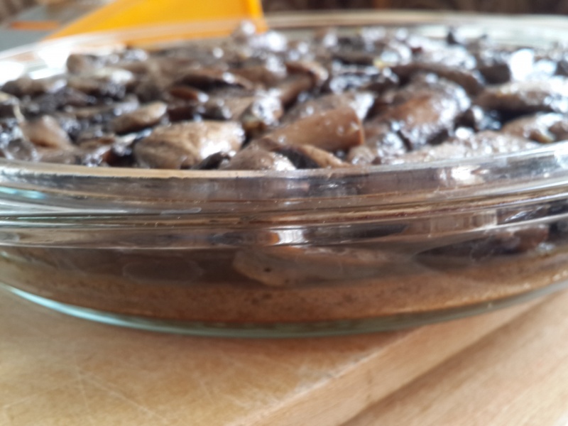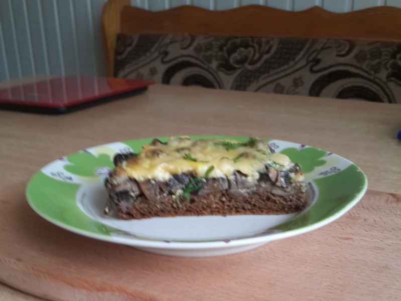 На готовый корж выкладываем грибочки, убрав лавровый лист, и