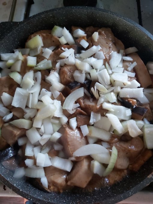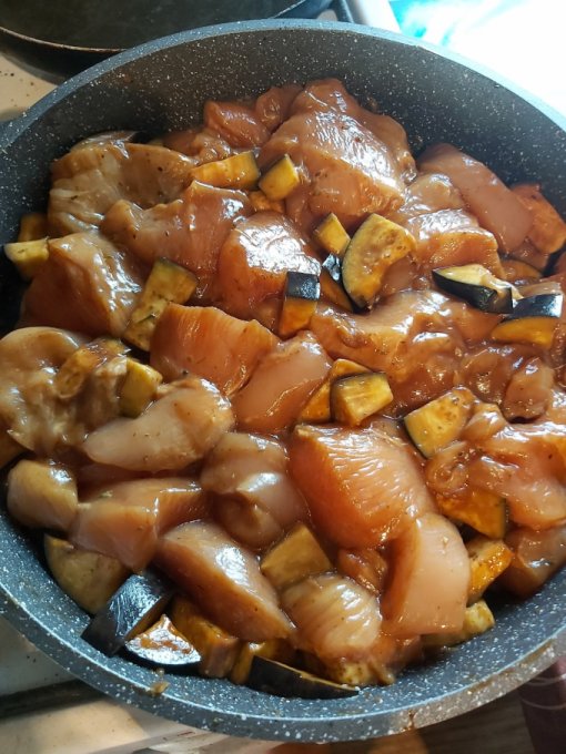 Ну и куриную грудку, на "гранитной" сковородке, с добавлением баклажанов, тоже под соевым соусом. Вкусно блин опять получилось... Отличная посуда фирмы "Мечта" серии "Гранит", мама подарил кастрюлю казан, очень понравилась, хоть маме 79 лет и она очень не любит менять посуду. Согласилась теперь еще и на сковородку.)))