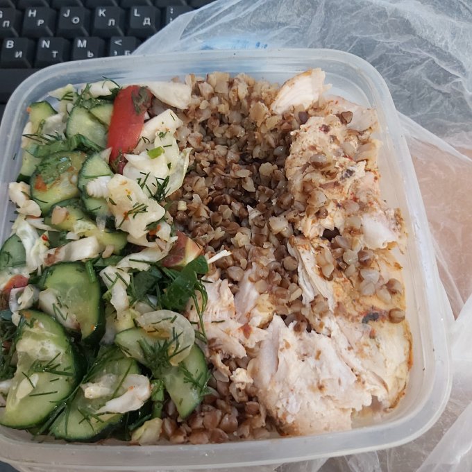 На фото поздний завтрак (12.00) и  обед (15.00) 300гр гречи 300 гр кур грудки 150 салата (вес готового) еще 100 гр тонкого лаваша с коллой зерро как десерт)))