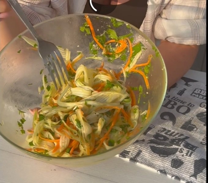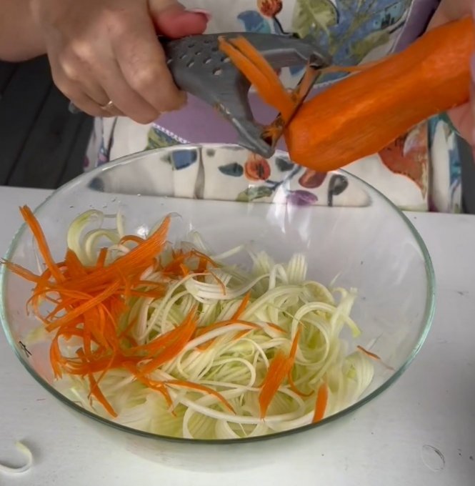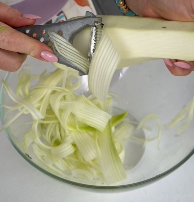 Нашла рецепт кабачков по-корейски у одного блогера. В списке ингредиентов на фото не хватает зеленушки (у блогера была петрушка). Сырые кабачки и морковь надо нарезать на ... даже не знаю, как это назвать... слайсы? У блогера специальная терка, но, на мой взгляд, можно обойтись обыкновенной овощечисткой. Да, будет не так красиво, ну и фиг с ним. Когда все ингредиенты нарезаны и перемешаны, салат должен промариноваться пару часов