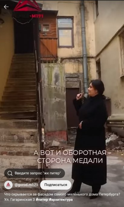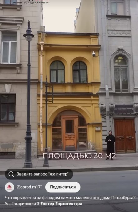 Дом, находящийся по адресу ул.Гагаринская 3, считается самым маленьким домом Санкт-Петербурга. Над входом имеется квартира площадью 30м². Вход сейчас находится на фасадной части дома, а до революции под квартирой была каретная арка. Соответственно вход был в другой стороны. И эта другая сторона была (и продолжает оставаться) непарадной стороной медали. В Питере, в общем-то, очень часто так.