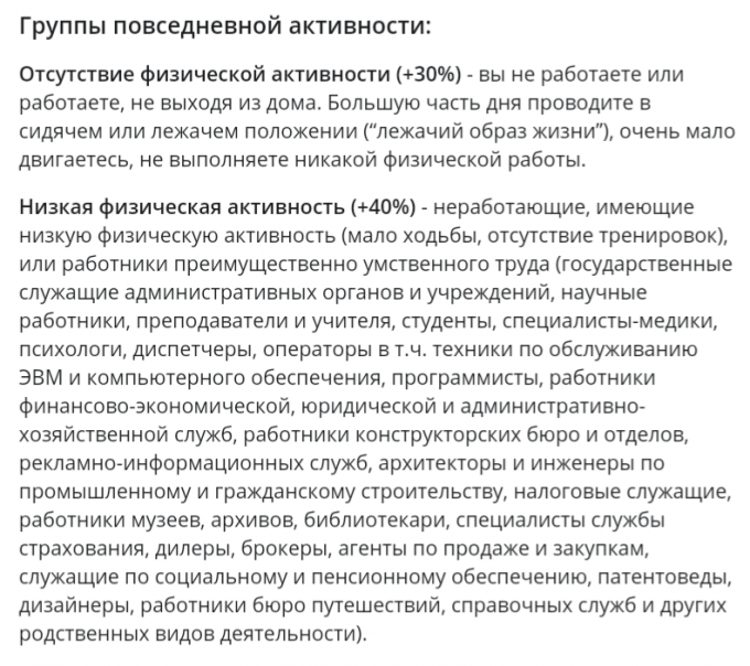 Высокая физическая активность (+120%) - неработающие, имеющие высокую физическую активность (активный образ жизни и тяжелые тренировки 6-7 раз в неделю) или работники тяжелого физического труда (строительные рабочие, грузчики, рабочие по обслуживанию железнодорожных путей и ремонту автомобильных дорог, работники лесного, охотничьего и сельского хозяйства, деревообработчики, физкультурники, металлурги доменщики-литейщики и другие родственные виды деятельности).