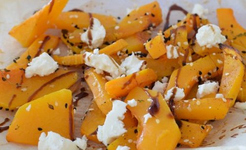 2. Выкладываем тыкву на тарелку, сверху крошим фету и присыпаем