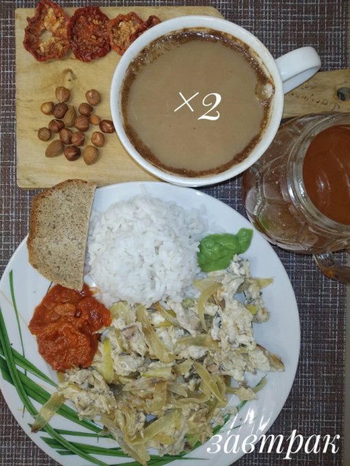 Завтрак: омлет (яйцо, 2 белка, лук, кунжутное масло), айвар, рис, васаби, хлеб, сушеные помидоры, орехи, кофе с медом и молоком.