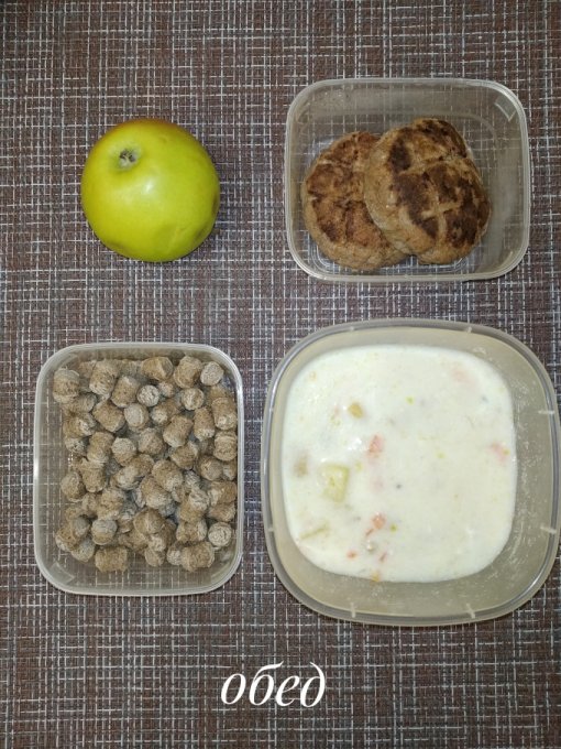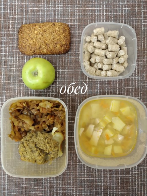 Обед: гороховый суп с копченой курицей, овсяные отруби, рыбная котлета (минтай, яйцо, плавленый сыр, льняная мука), тушеная капуста, яблоко, батончик (геркулес, банан🍌, кокосовая стружка), черный кофе.