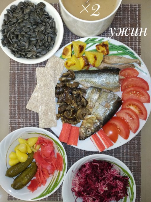 Ужин: запеченная сельдь, икра сельди, крабовые палочки, запеченный картофель, жареные баклажаны, помидор, хлебцы, соленья, салат (сырая свекла, сыр, чеснок, оливковое масло), семечки, чай с молоком.