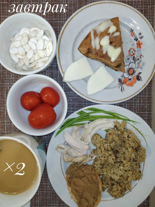 Завтрак: филе куриное, ячневая каша на костном бульоне, хлеб с паштетом, соленые помидоры, адыгейский сыр, шоколадный кекс с финиками, сгущенка, тыквенные семечки, кофе с молоком.