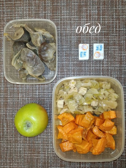 Обед: желудки куриные, тушеная капуста с соевой спаржей, запеченная морковь, яблоко, кофе с сахаром.