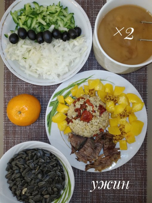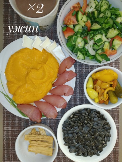 Ужин: моцарелла, тыквенное пюре с соевым протеином, сушеные томаты, овощной салат со сметаной, соленья, овсяные отруби, семечки, кофе с молоком.