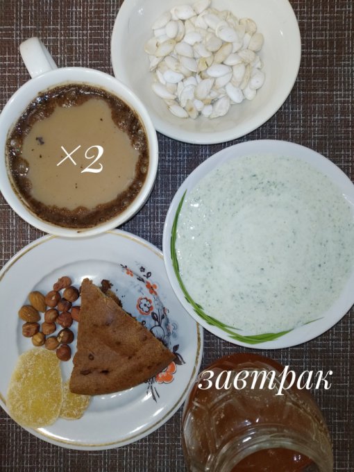 Завтрак: "ленивая" овсянка (геркулес, кефир, соевый протеин, шпинат), шоколадный кекс с финиками, имбирь в сахаре, орехи, тыквенные семечки, кофе с молоком.