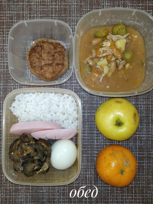 Обед: рассольник с фасолью, рис, жареные баклажаны, яйцо, ветчина с индейкой, сырник с льняной мукой, яблоко, мандарин.