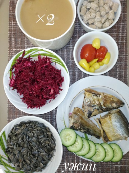 Ужин: запеченная сельдь, огурец, салат (сырая свекла, сыр, сливочно-чесночный соус), соленья, овсяные отруби, семечки, чай с молоком.