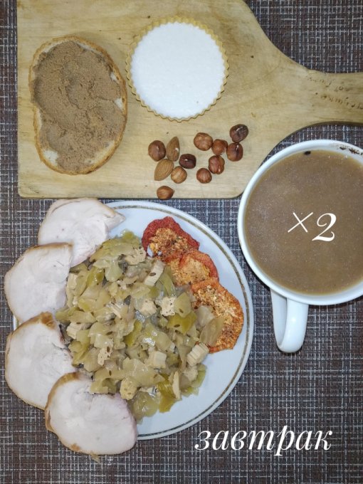 Я всем довольна: комфортный вес, меню с вкусняшками и не нужно тратить время на взвешивание моей разнообразной трапезы✨Завтрак: копченая куриная грудка, тушеная капуста с соевой спаржей, сушеные томаты, хлеб с паштетом, орехи, кокосовое желе, кофе с молоком.