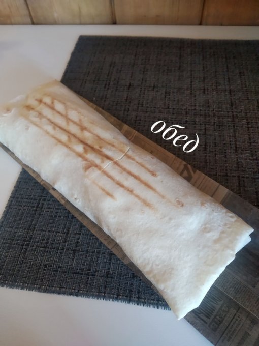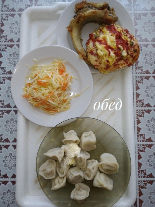 Обед: пельмени с майонезом, пицца, жареный минтай, капустный салат, песочный корж, черный кофе.