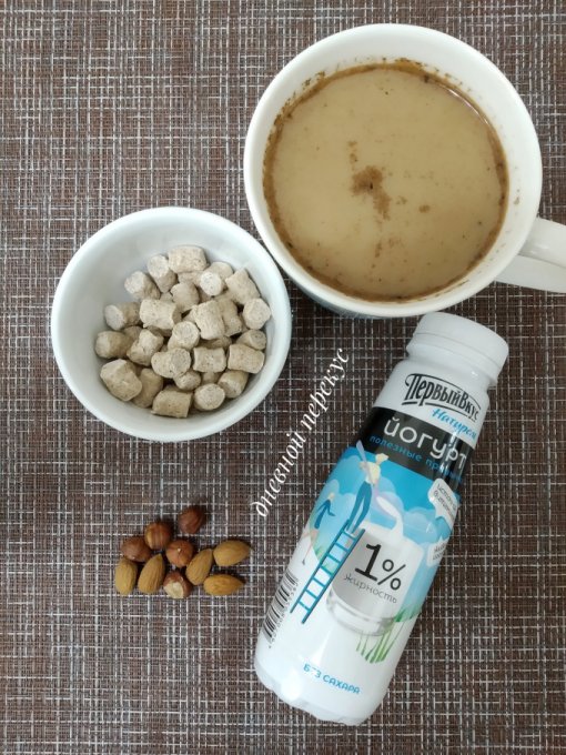 Дневной перекус: питьевой йогурт 1%, овсяные отруби, орехи, кофе с молоком.