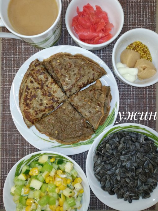 Ужин: блинчики*, начинка для блинов (икра трески, майонезный соус 15%, горчица зернистая), маринованный имбирь, салат (сельдерей, огурец, яблоко, кукуруза, лук, оливковое масло), семечки, чай с молоком.
