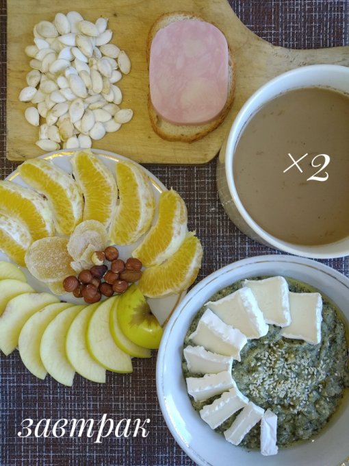 Завтрак: каша (полента, киноа, специи, кунжут, кунжутное масло), сыр с плесенью "Бри", апельсин, яблоко, имбирь в сахаре, орехи, бутерброд с ветчиной, тыквенные семечки, кофе с молоком.