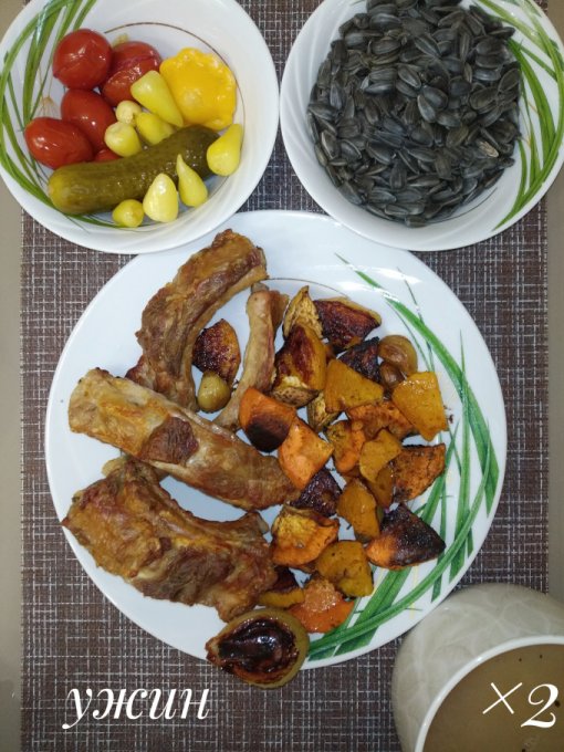 Ужин: свиные ребра запеченные с овощами (тыква, репа, морковь, чеснок, лук), соленья, семечки, кофе с молоком.