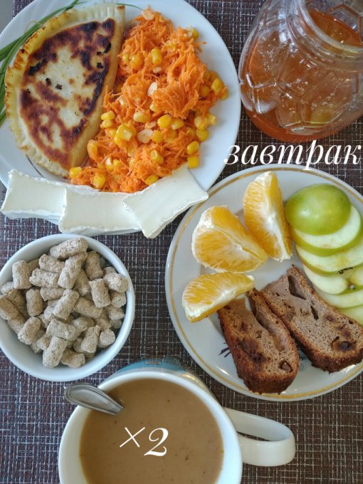 Завтрак: чебурек, салат🥕 с майонезным соусом, сыр с плесенью "Бри", шоколадный кекс с финиками, яблоко, апельсин, овсяные отруби, кофе с молоком и медом.
