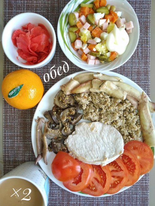 Обед: свинина, запеченная икра и молоки сельди, жареные баклажаны, ячневая каша на костном бульоне, помидор, салат "Оливье", маринованный имбирь, мандарин, чай с молоком.