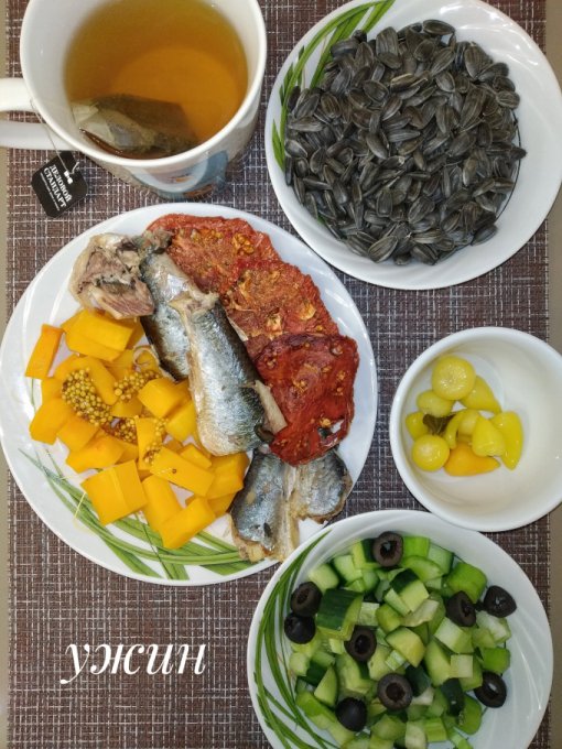 Ужин: запеченная сельдь, тыква на пару, зернистая горчица, сушеные томаты, маринованные перцы, салат с бальзамическим уксусом, семечки, зеленый чай.