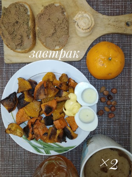 Завтрак: яйцо, запеченные овощи (тыква, репа, морковь), сырный соус, хлеб с паштетом, орехи, мандарин, "улитка" из слоеного теста🥐, кофе с молоком и медом.