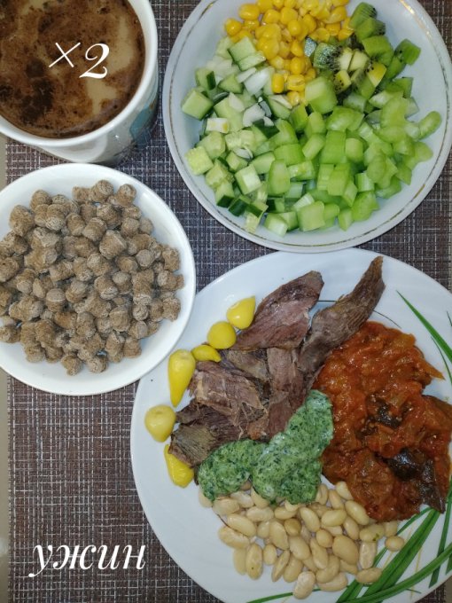 Ужин: запеченная утка, отварная фасоль, баклажаны🍆 в аджике, сливочно-чесночный соус со шпинатом, маринованный перец, салат (огурец, сельдерей, киви, кукуруза, лук, оливковое масло), ржаные отруби, кофе с молоком.