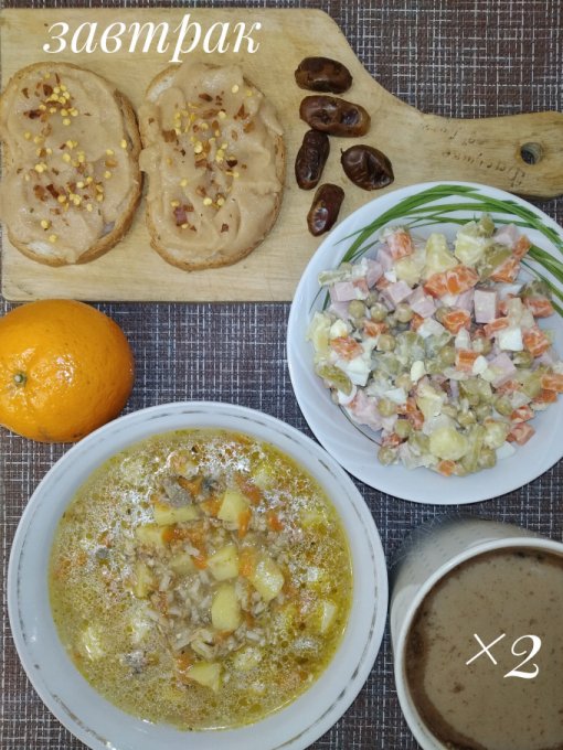 Завтрак: суп с рыбными консервами, салат "Оливье", бутерброды с икрой трески и перцем чили, финики, мандарин, кофе с молоком.