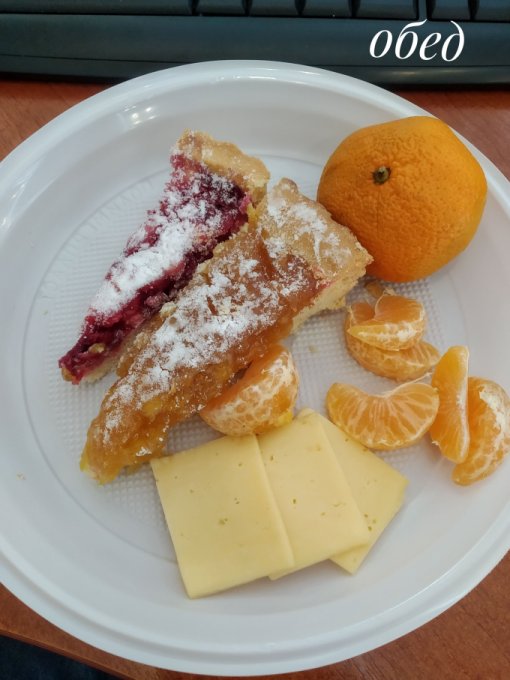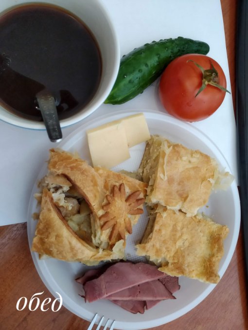 Обед: пироги сытные (капуста+яйцо и курица+картошка), сыр, ветчина, огурец, помидор, пироги сладкие🥧 (лимон и смородина), мандарины, черный кофе.