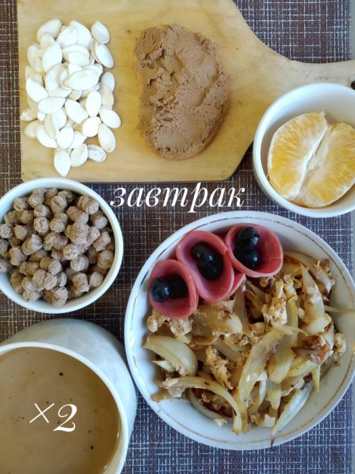 Завтрак: омлет (2 яйца+1 белок, лук, кунжутное масло, соевый соус), копченая говядина, оливки, бутерброд с паштетом, тыквенные семечки, ржаные отруби, апельсин, кофе с молоком.