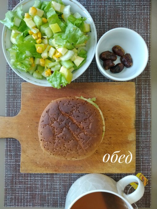 Обед: бургер, салат с оливковым маслом, финики, чай.
