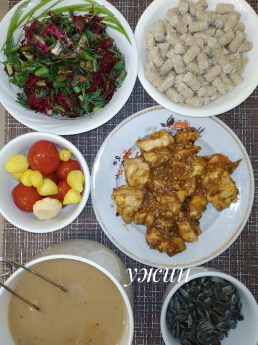 Ужин: курица в имбирно-остром соусе, салат из сырой свеклы с майонезным соусом, соленья, овсяные отруби, семечки, чай с молоком.
